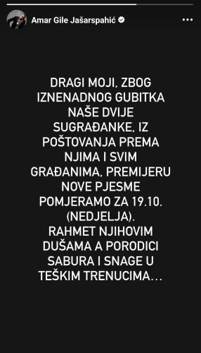 -Dragi moji, zbog iznenadnog gubitka naše dvije sugrađanke, iz poštovanja prema njima i svim građanima, premijeru nove pjesme pomjeramo za 19. 10. (nedjelja). Rahmet njihovim dušama, a porodici sabura i snage u teškim trenucima.