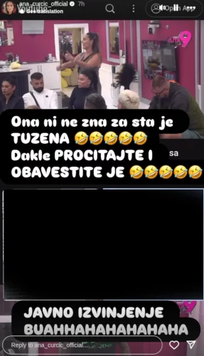 – Ona ni ne zna za šta je tužena. Dakle, pročitajte i obavijestite je. Javno izvinjenje? Buhahahaha – napisala je Ana.