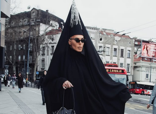 Naime, šoumen je na ulici pozirao pred fotografom u crnoj haljini koju je upotpunio neobičnim špicastim šeširom sa crnim velom.