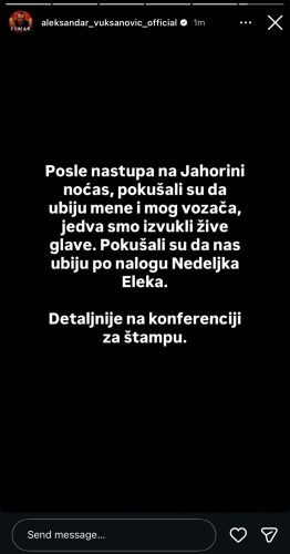 – Nakon nastupa na Jahorini sinoć, pokušali su ubiti mene i mog vozača. Jedva smo izvukli žive glave. Pokušali su nas ubiti po nalogu Nedeljka Eleka. Više detalja na konferenciji za novinare – napisao je Aca Lukas na svom Instagram profilu.