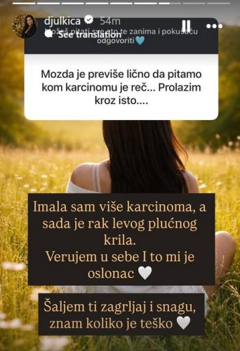 – Imala sam karcinom, a sada je rak lijevog plućnog krila. Vjerujem u sebe i to mi je oslonac. Šaljem ti zagrljaj i snagu, znam koliko je teško – napisala je Đulkica emotivno i iskreno.
