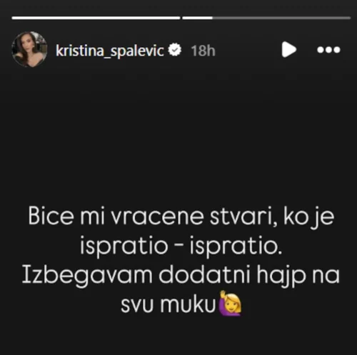 Nakon svega, Spalevićeva se ponovo kratko oglasila na Instagramu, poručivši da će joj otuđene stvari biti vraćene.