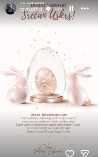 „Hristos vaskrse! Srećan Uskrs! Srećan i blagosloven Uskrs! Neka praznik Hristovog vaskrsenja donese novu snagu, vedrinu i vjeru u bolje sutra. Želim vam da praznične dane provedete u slozi, ljubavi i radosti, uz obilje zdravlja, sreće i porodičnog blagostanja“, napisala je Milica Todorović.