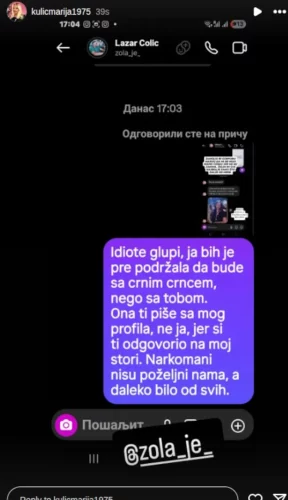 – Idio*e glupi, ja bih je prije podržala da bude sa crnim crncem, nego sa tobom. Ona ti piše sa mog profila, ne ja, jer si ti odgovorio na moj stori. Narkoma*i nisu poželjni nama, a daleko bilo od svih.,
