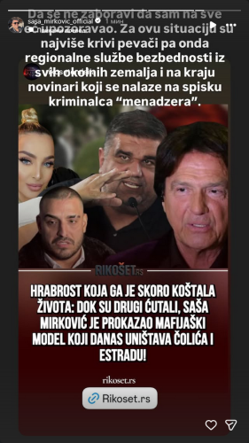 Vlasnik i direktor Hype produkcije, Saša Mirković nastavio je sa razotkrivanjem mafijaškog modela koji potresa estradu nakon sve učestalijih napada kriminogenih menadžera na javne ličnosti, a povezano sa skorašnjim bombaškim napadom na kuću Zdravka Čolića, te se tim povodom oglasio se na svom Instagram nalogu.