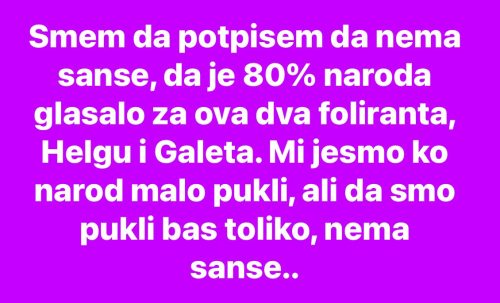„Smejem da potpišem da nema šanse, da je 80% naroda glasalo za ova dva foliranta, Helgu i Galeta. Mi jesmo kao narod malo pukli, ali da smo pukli baš toliko, nema šanse…“, piše u opisu posta.