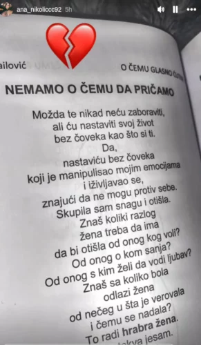Ana se danas oglasila na svom Instagram storiju, podijelivši tužnu pjesmu koja govori o manipulaciji, izdaji i hrabrosti da se krene dalje bez onoga koga voliš. Nažalost na slici se ne vidi ko je autor ovih stihova, ali mi vam donosimo pjesmu koju je okačila Ana i koja je nesumljivo posvećena Kordi: