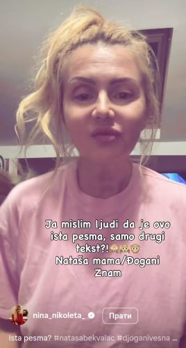-Ja mislim, ljudi, da je ovo ista pjesma, samo drugi tekst?! Nataša — ‘Mama’, Vesna — ‘Znam ja’! — napisala je Nikoleta, uz video kolaž u kojem je spojila dvije numere, označivši i Bekvalčevu i Đogani u objavi.
