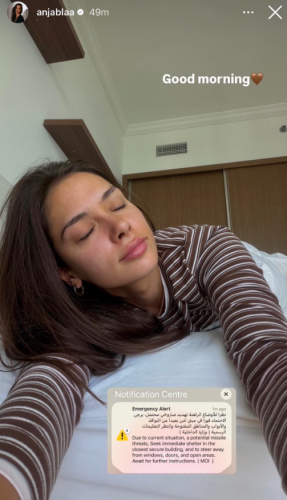 Zbog aktuelne situacije i sukoba na Bliskom istoku, mnogi građani su zabrinuti za bezbjednost, pa iz predostrožnosti ostaju u svojim domovima. Anja je na društvenim mrežama podijelila fotografiju važnog obavještenja koje joj je stiglo putem SMS poruke. U poruci se građani upozoravaju na aktuelnu situaciju i dobijaju određene smjernice u vezi s bezbjednošću.