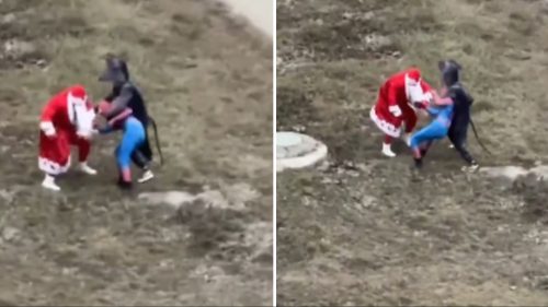Na video snimku se vidi nesvakidašnja “praznična tučnjava” u kojoj se u uličnoj borbi sukobljavaju Djed Mraz i Spider-Man.