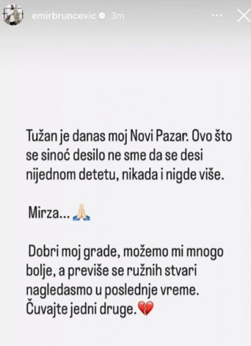 – Tužan je danas moj Novi Pazar. Ovo što se sinoć desilo ne smije da se desi nijednom djetetu, nikada i nigdje više. Mirza… – započeo je pjevač.