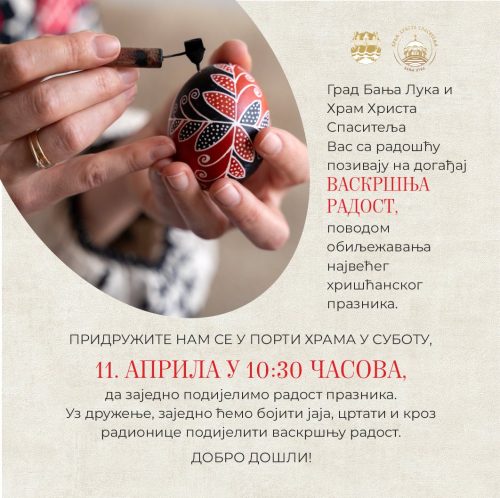 – Pridružite nam se u porti Hrama da zajedno podijelimo radost praznika. Uz druženje, zajedno ćemo bojiti jaja, crtati i kroz radionice podijeliti vaskršnju radost, saopšteno je iz Gradske uprave Banjaluka.