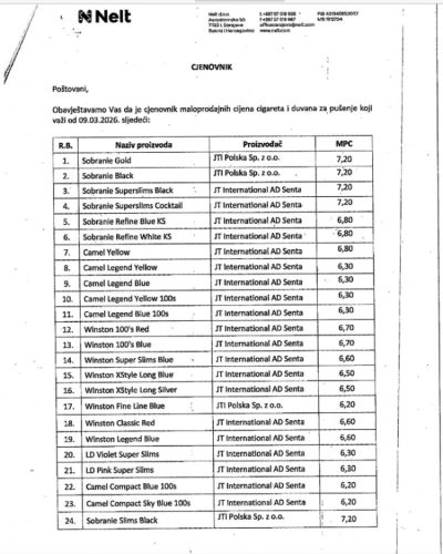 Isto tako, nove cijene najavio je i Nelt, a cjenovnik će primjenjivati od 9. marta 2026. godine.