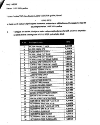 Tako će se od 13. februara primjenjivati novi cjenovnik za cijene cigareta koje distribuira Tvornica duhana Rovinj (TDR), a najskuplje cigarete iznosit će 7,20 KM.