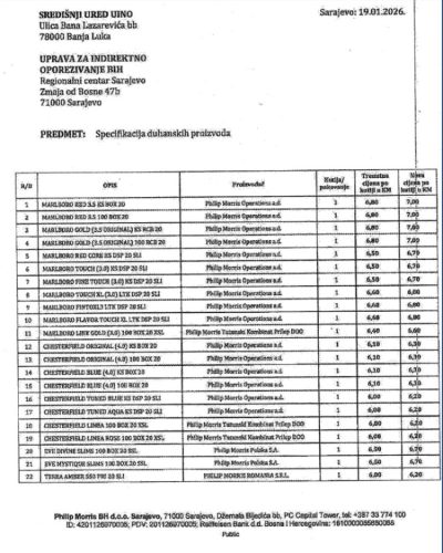 Uprava za indirektno oporezivanje Bosne i Hercegovine saopćila je kako će se od 13. februara primjenjivati nove maloprodajne cijene cigareta za nekoliko distributera.