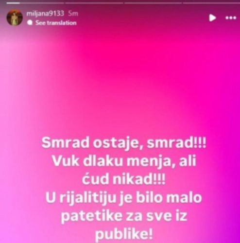– Smr*d ostaje smr*d! Vuk dlaku menja, ali ćud nikad! U rijalitiju je bilo malo patetike za sve iz publike – napisala je Miljana i dodala.